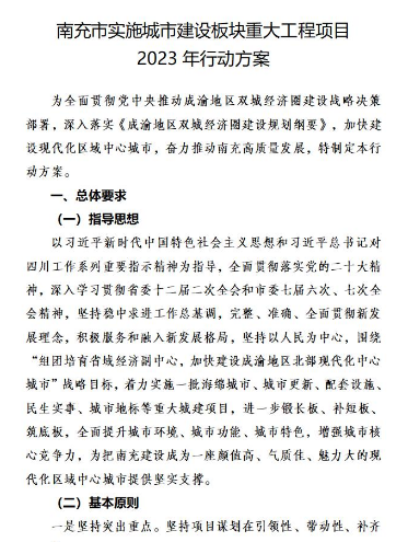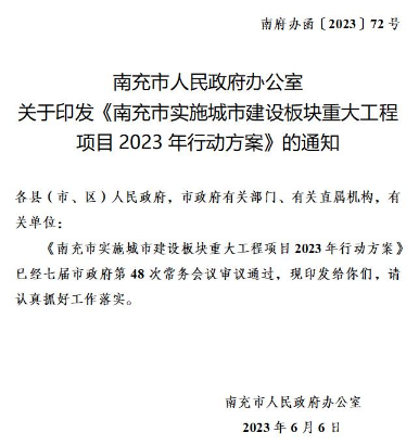 日前,南充市人民政府办公室发布关于印发《南充市实施城市建设板块重大工程项目2023年行动方案》(以下简称《方案》)的通知。