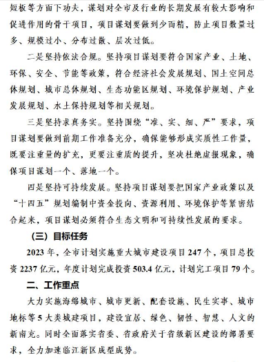 《方案》指出,2023年,全市计划实施重大城市建设项目247个,项目总投资2237亿元,年度计划完成投资503.4亿元,计划完工项目79个。