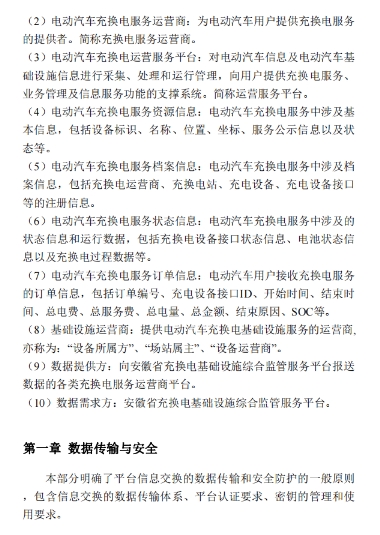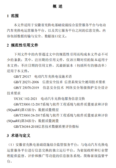 文件中指出,本文件适用于安徽省充换电基础设施综合监管服务平台与电动汽车充换电运营服务平台、以及其它服务平台之间的信息交换。内容包括数据传输与安全、数据接口定义。