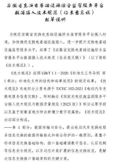 关于征询社会公众对《安徽省充换电基础设施综合监管服务平台数据接入技术规范(征求意见稿)》意见的公告